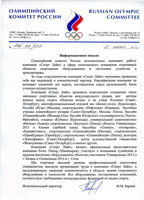 Олимпийский Комитет России положительно оценил работу компании "Спорт Лайн" в сфере комплексного оснащения спортивных объектов спортивным оборудованием,
